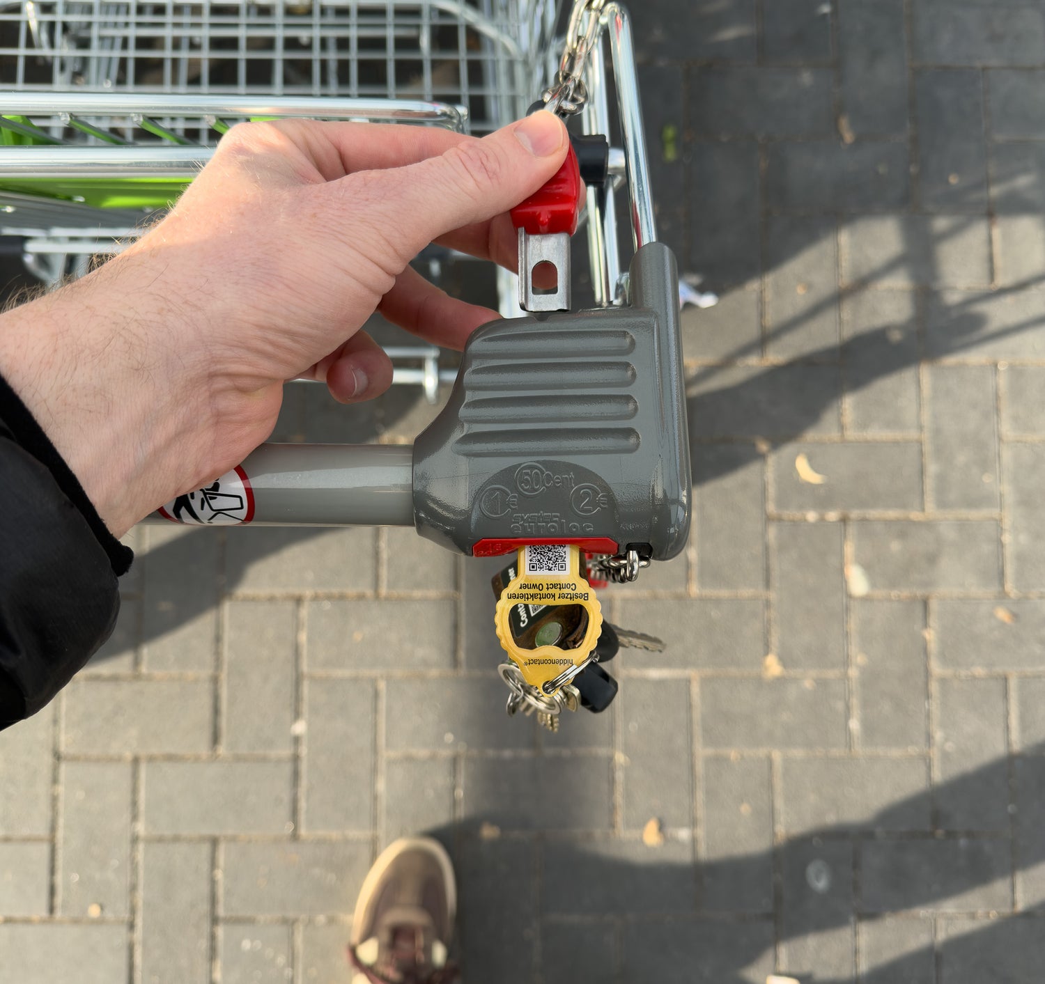 Einfach einstecken, entriegeln, herausziehen – der Einkaufswagen bleibt frei, der Schlüsselbund bei dir.